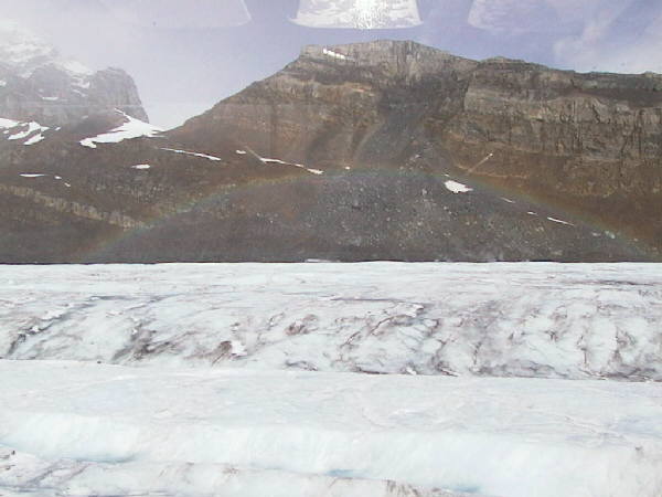 左はアサバスカ氷河の雪上車の窓から見た氷河の上の虹。